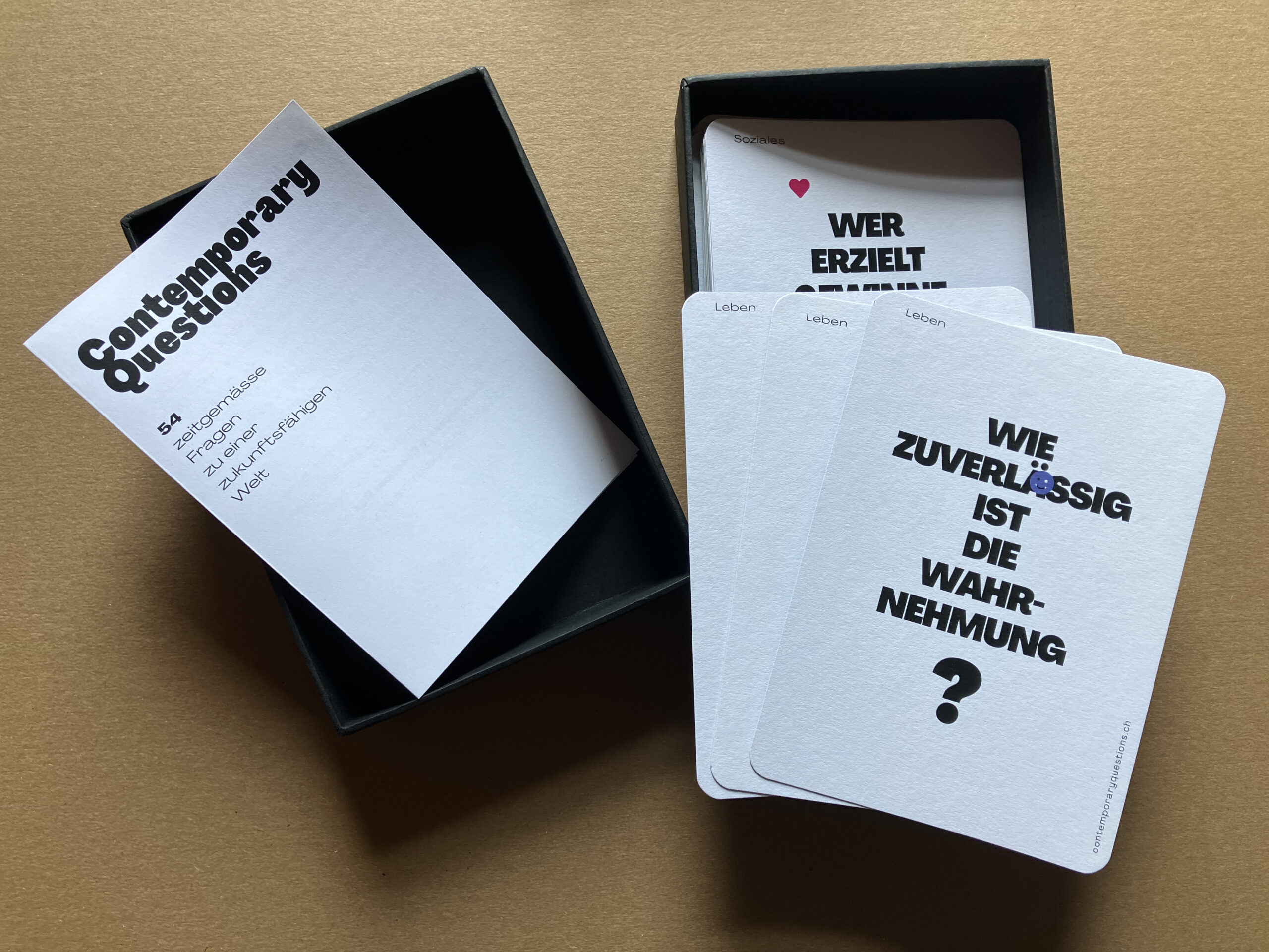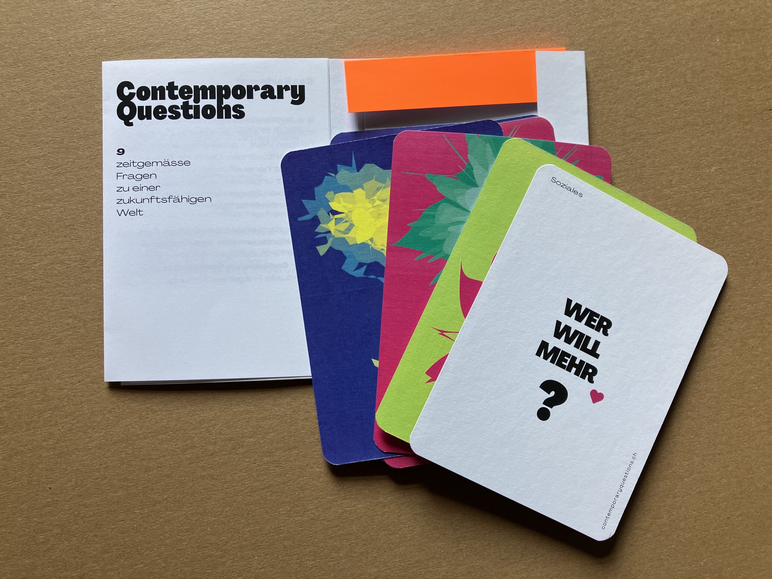 Das Kartenspiel mit ausgewählten Fragen aus der Sammlung macht den Puls der Zeit fühl- und sichtbar. Es regt zum Nachdenken an und ermöglicht einen spielerischen Einstieg in Gespräche. Das Kartenset ist ein ideales Tool für Workshops mit Schulklassen, Teams, Senior:innen oder Menschen aus verschiedenen Kulturen. Gemeinsam können weitere Fragen gesammelt und diskutiert werden.